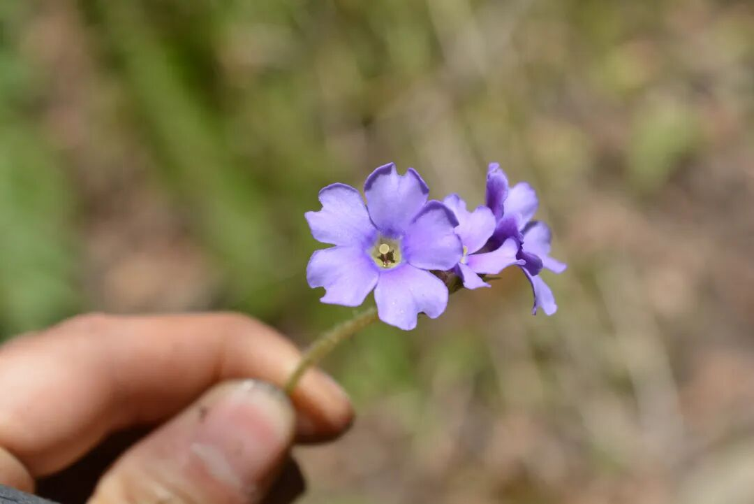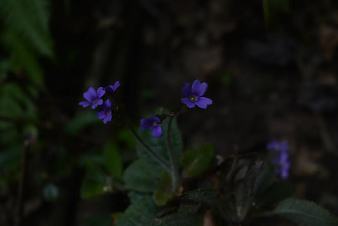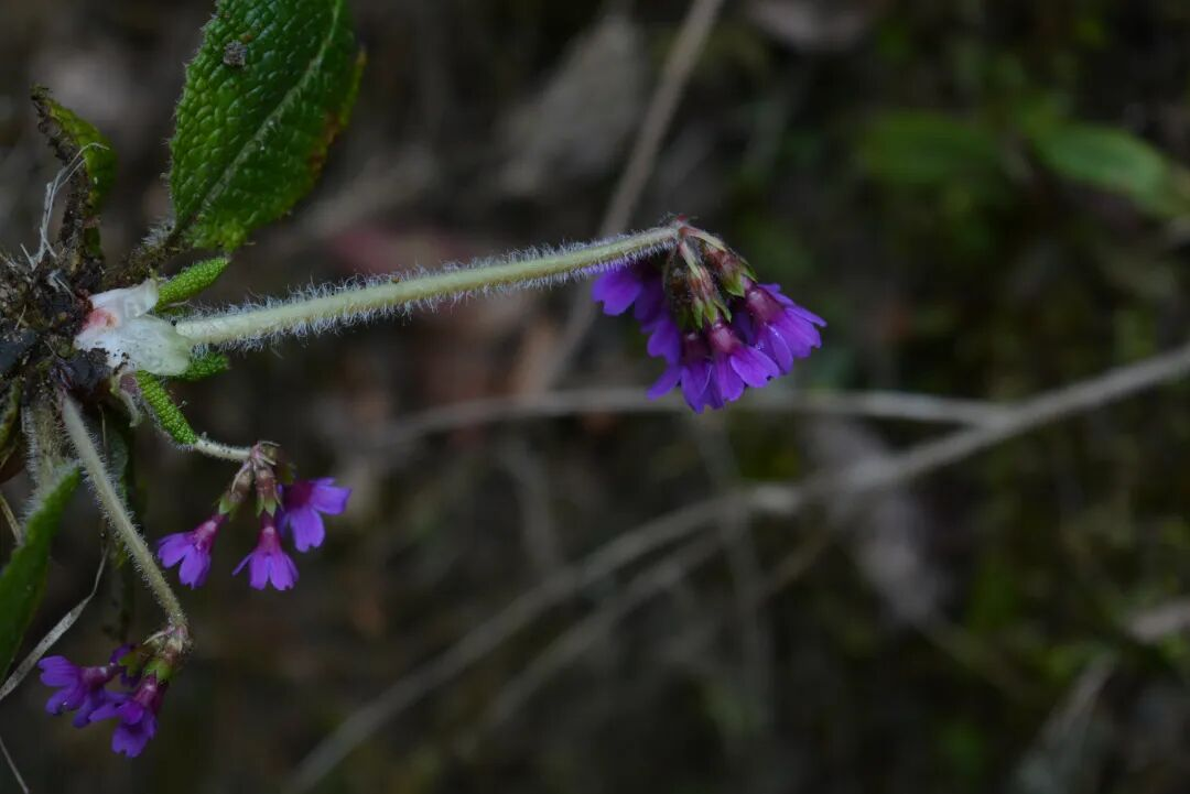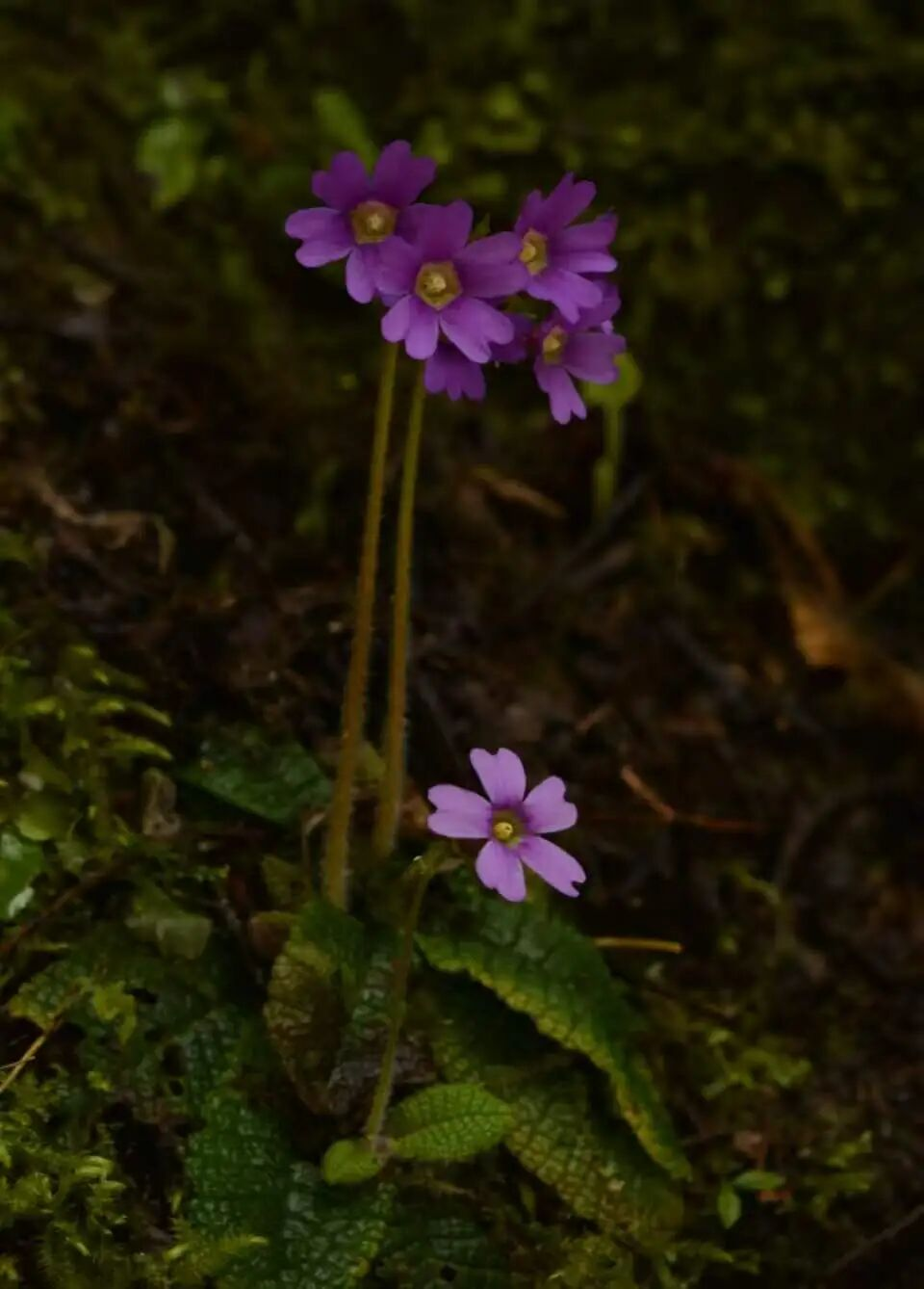 多年生草本。全株无粉,花期有鳞片。叶阔椭圆形或矩圆状椭圆形至阔倒卵形,有时近圆形,边缘具不明显的小圆齿或具胼胝质尖头的小牙齿,干时坚纸质至近革质,叶背面沿中肋和侧脉被多细胞柔毛;叶密被多细胞柔毛,长约为叶片的1/3。伞形花序,花葶被柔毛:花萼钟状,外面被微柔毛,裂片卵形至卵状披针形;花冠紫色或蓝紫色,喉部具环状附属物,裂片倒卵形,先端具深凹缺;长花柱花:冠筒略长于花萼或与花萼等长,雄蕊着生于冠筒中部,花柱与冠筒等长或微伸出筒口;短花柱花:冠筒约长于花萼0.5倍,雄蕊近冠筒口着生。蒴果球形。